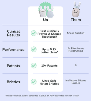 Don't be fooled by cheap, u-shaped silicone knockoffs that are proven to be as effective as not brushing at all. autobrush is the only nylon u-shaped toothbrush with clinical results proving it removes up to 82% more plaque* than a traditional brush.